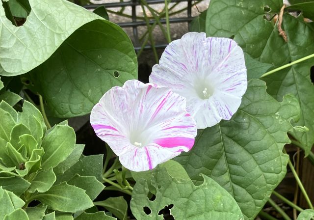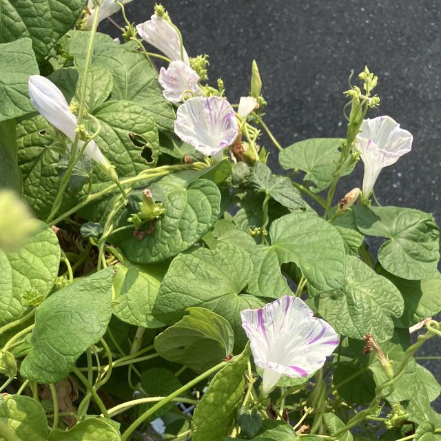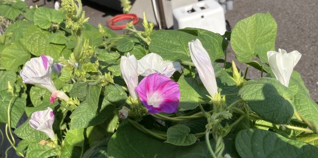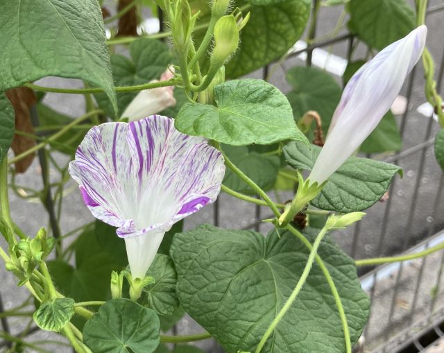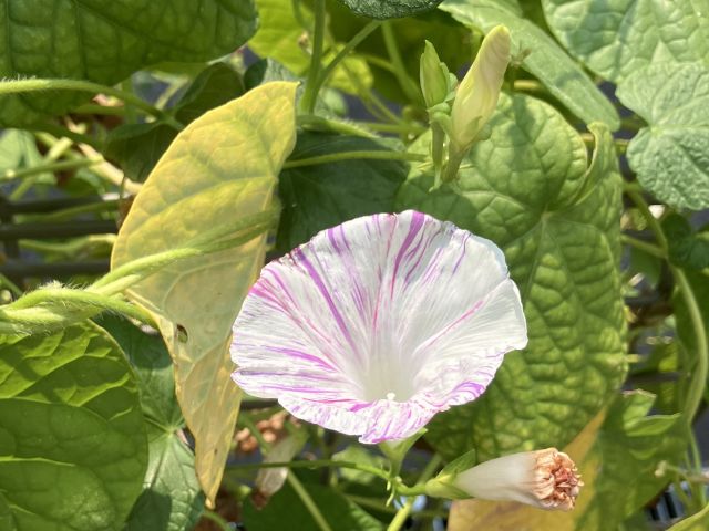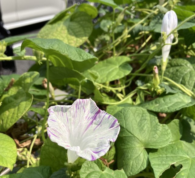 こんな暑いさなかですが、玄関横の花壇では、何とか西洋朝顔が花を咲かせてくれています。