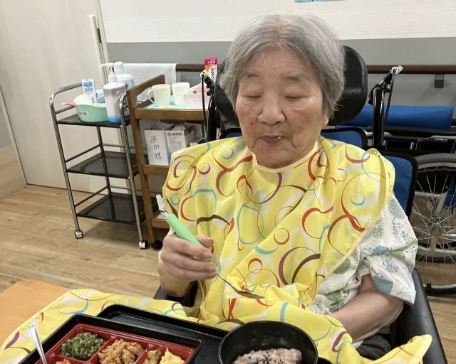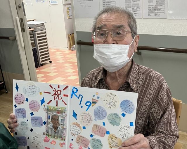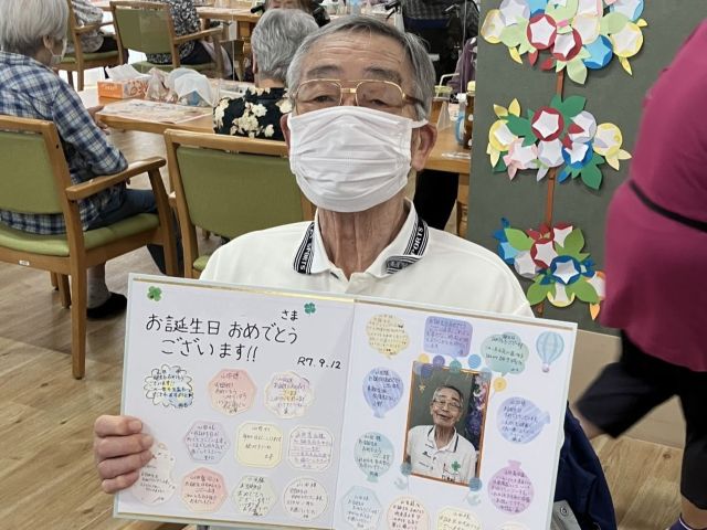 この日のメインイベントは午後からの「敬老会」。それに先立ち、昼食前に9月のお誕生の方のお祝いを行いました。また、この日は敬老会のお祝いとして特別な昼食が提供されました。