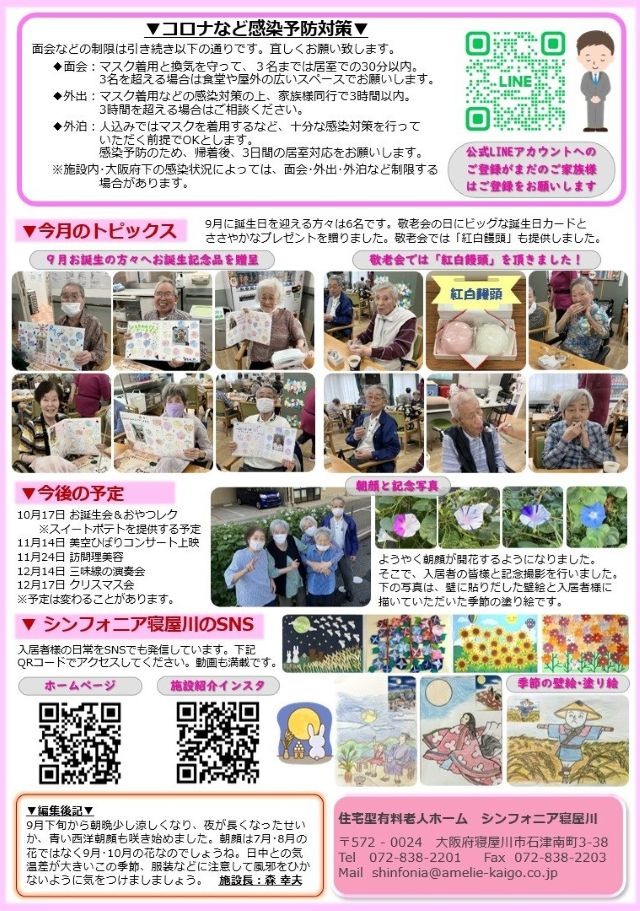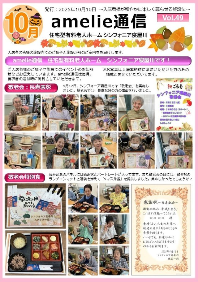 ようやく涼しくなってまいりました。今月もフライングでamelie通信の最新号(10月号)を発行します。今月は敬老会関連の情報が満載です。