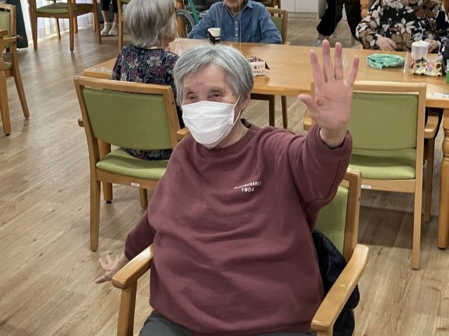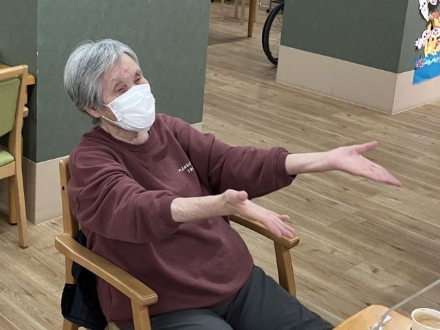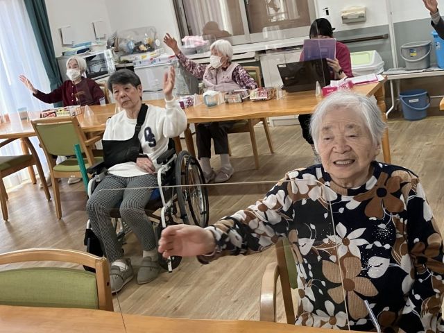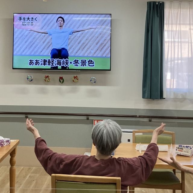 他の方はいつものように体操に取り組まれています。今日は皆さんがご存じの歌謡曲に合わせた体操です。