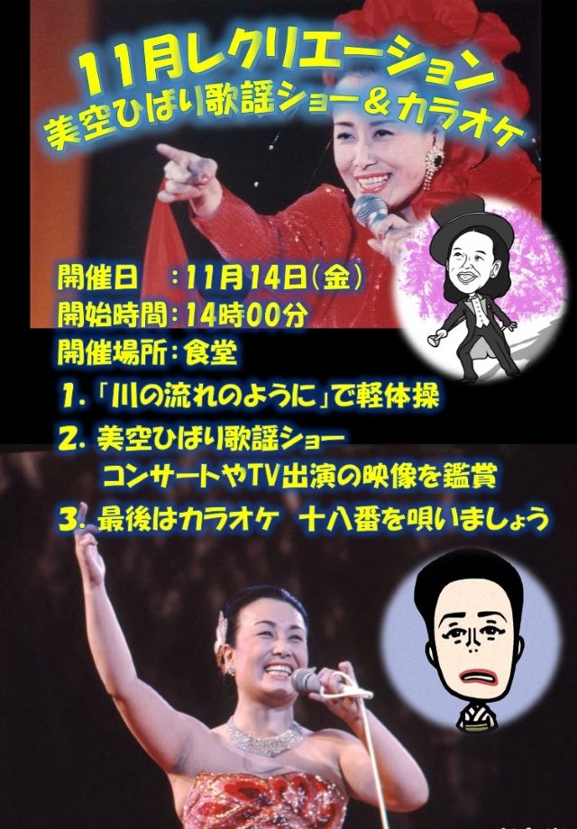 11月14日、美空ひばり歌謡会を開催。上記プログラム通りに行いました。