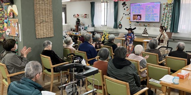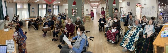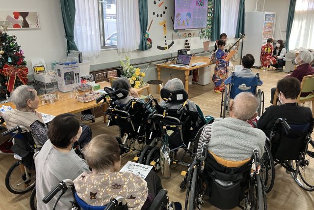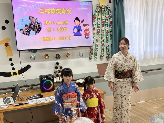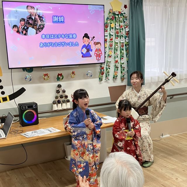 12月14日、シンフォニアでは守口市を中心に活動されている三味線奏者のyuka氏をお迎えし、三味線の演奏会を開催しました。そして、2人のお孫様に三味線の伴奏に合わせて唄っていただきました。