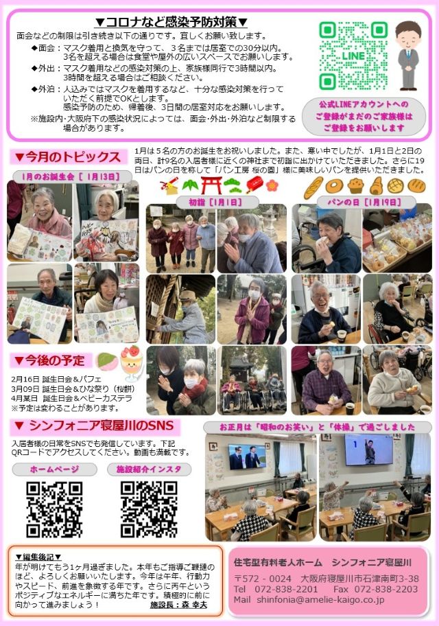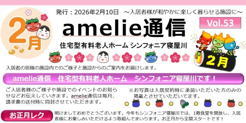 2月10日発行予定のシンフォニア寝屋川のamelie通信2月号です。お正月に行った様々な行事を紹介しています。