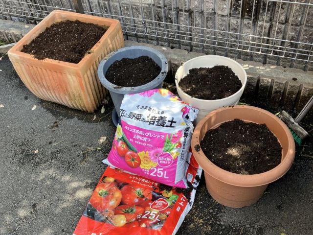 トマトの土だけでは足りなかったので、花と野菜の培養土を追加。