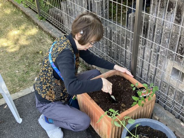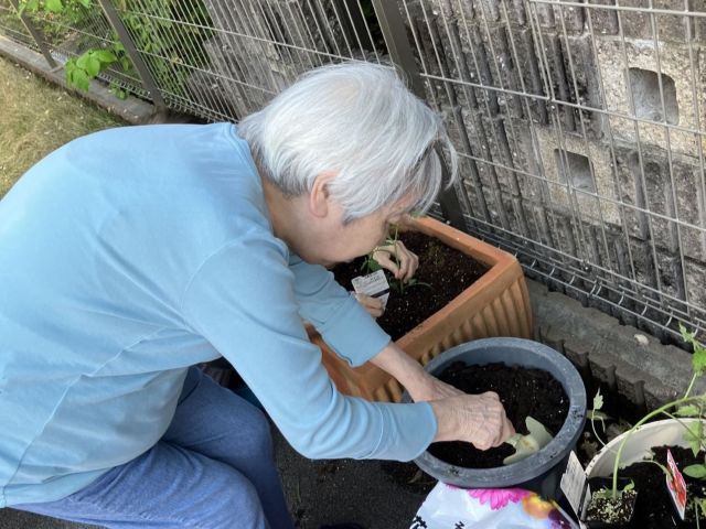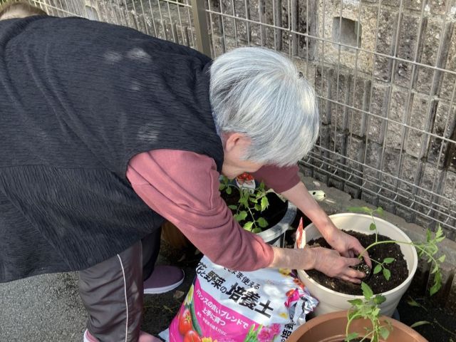 土が用意できたので、早速、ミニトマトの苗を植えていただきました。少し長細いアイコの苗です。土いじりが大好きな入居者様にご協力いただきました。